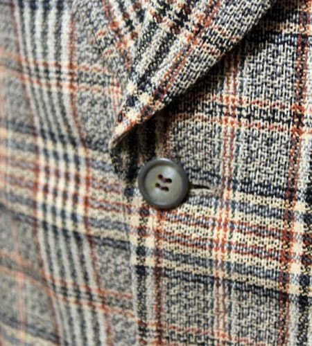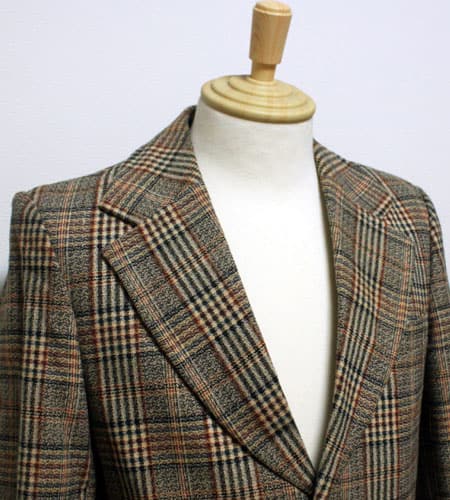 着丈72cm、身幅47cm。カラーはライトブラウン。70年代、デッドストック、フランス製、グレンチェックのテーラードジャケットです二つボタンのタータンチェックのテーラードで今のトレンドらしいデザインですね。アームホール、身幅も細めのシルエットでタウンユースではもちろんドレススタイルでも合わせられるジャケットです。