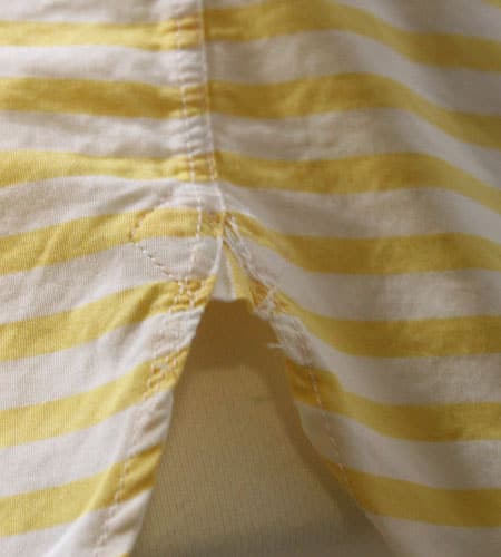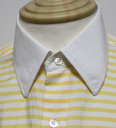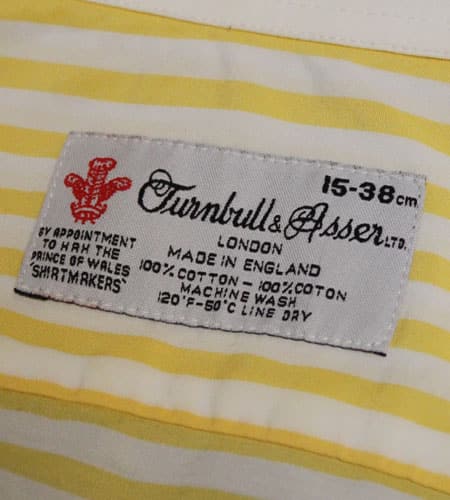 着丈76cm、身幅48cm。カラーはイエロー×白。イングランド製、ターンブル&アッサーのストライプカフスシャツです。100年以上の歴史を持つイギリスのシャツメーカーで王室御用達も受けています。斬新なサイドストライプでまたシェイプされたウエストラインは着た時のシルエットがとても綺麗です。ここまで洗練された品のあるシャツは中々ありません。