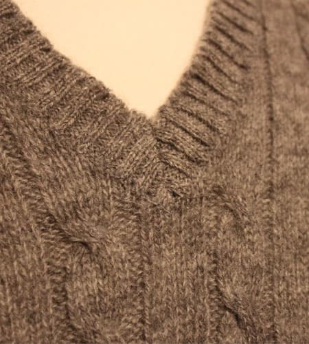 着丈63cm、身幅48cm。サイズS。カラーはグレー。70年代、UK製のシェットランドベストです。シェットランドウール100%のケーブル編みのベストになります。ありそうでない無地のシェットランドベストは着回しの効きシーズンは真夏以外であれば着られるのでとても重宝する一枚です。
