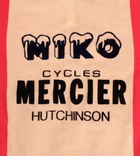 着丈64cm、身幅45cm。カラーはネイビー×ピンク×白。デッドストック、70年代、フランス製、メルシエールのサイクリングジャージです。フランスのサイクルチームのメルシエールのジャージでこちらはフランスのアイスクリーム会社のMIKOがメインスポンサーだった頃の物になります。チームジャージとは思えない可愛らしいデザインのサイクリングジャージです。小さ目なので女性の方でも着られます。