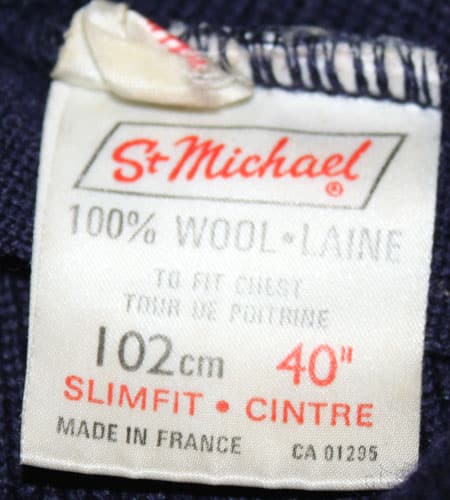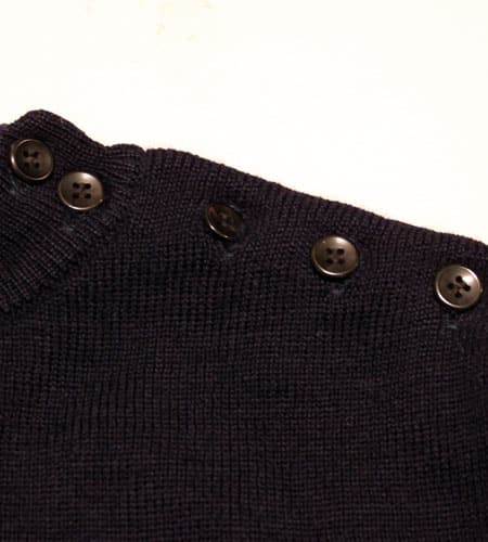 着丈66cm、身幅47cm。カラーはネイビー。70年代、フランス製、マリーンニットです。本場フランスのマリーンニットで今の製品とは違った趣のあるアイテムです。肩口のボタン、目の詰まった肉厚のニット、ファッション性も十分に取り入れつつなおかつ機能性に重点を置いた本物のニットです。ヨーロッパ古着では外せない一枚です。