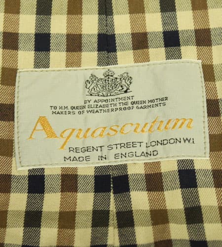 着丈104cm、身幅50cm。サイズ34。カラーはベージュ。80年代、イングランド製、アクアスキュータムのステンカラーコートになります。1851年創業の英国トラッドそしてトレンチ、ステンカラーコートの代名詞的存在のアクアスキュータム。こちらは希少なイングランド製の物になり、サイズ34という素晴らしいサイズになります。裏地は象徴でもあるクラブチェックの裏地で開けて着てもチラッとこのチェックが見え隠れする感じが洒落てるというか洒落てます。バーバリーのバーバリーチェックも良いですが、このアクアスキュータムのクラブチェックも本当に素晴らしいです!