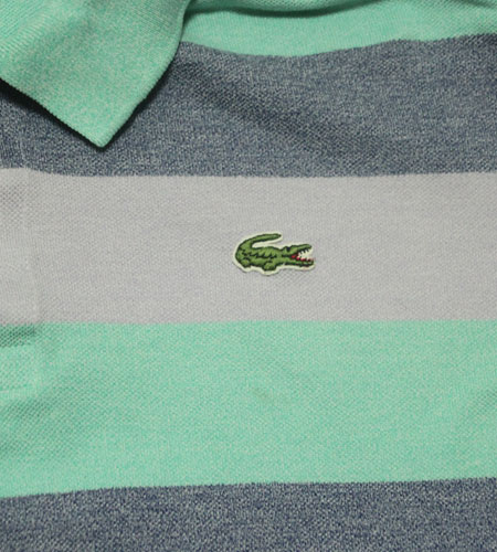 着丈72cm、身幅55cm。サイズ6。カラーはパープル×ミントグリーン。70年代、フランス製、ラコステのポロシャツです。通称フララコと呼ばれる人気のあるアイテムです。こちらは鹿の子地のポロになります。ヨーロッパ古着では夏の定番ですね!
