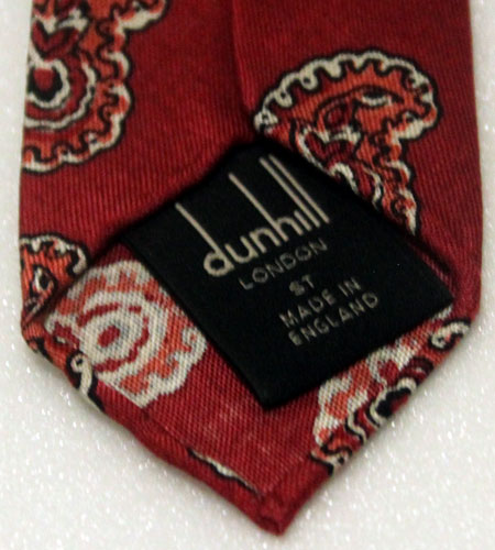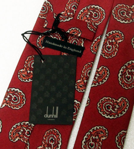 新品。長さ150cm、剣先幅8cm。カラーはレッド。2000年代、デッドストック、シルク100%、イングランド製、ダンヒルのネクタイです。こちらはイギリスのラグジュアリーブランドダンヒルのネクタイになります。数少ないイングランド製の物で品のあるペイズリー柄が印象的です。