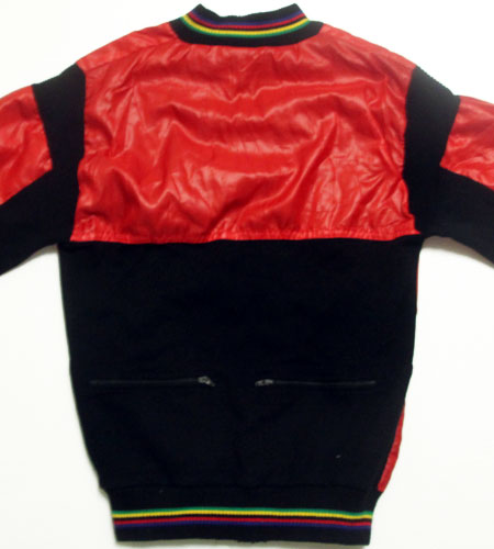 着丈65cm、身幅52cm。カラーはレッド×ブラック。70年代、フランス製、フルジップタイプのサイクリングジャージです。フルジップジャージで艶のあるナイロンとニットの組み合わせでフロントはナイロン張りになっています。バックポケットもついていて正にクラシックデザインなサイクリングジャージです。