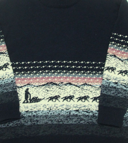 着丈75cm、身幅59cm。サイズXL。カラーはネイビー。80年代、フィランド製のノルディックセーターです。オーバーサイズシルエットのセーターで犬ぞりの柄というこれ以上ないくらいに可愛らしいパターンになります。こういうニットってアクリル素材の物が多いのですがしっかりとウール100%でさすがフィンランド製ですね!