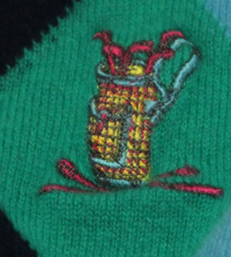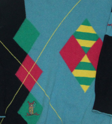 着丈67cm、身幅53cm。サイズM。カラーはネイビー×水色。80年代、イングランド製、サンミッシェルのゴルフニットです。ゴルフニットならではの派手なマルチカラーのカラーリングが逆に今っぽく幾何学模様のアーガイルも斬新です。男女ともに可愛らしく着られる一枚です!