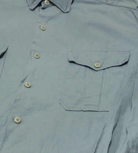着丈82cm、身幅63cm。サイズ43。カラーは薄いサックスブルー。70年代、西ドイツ軍のワークシャツです。古いワークシャツでドイツ軍の物によくある国章がないシンプルなデザインでどことなくヘラクレスのワークシャツのようなアメリカ物に近い雰囲気がある一枚です。