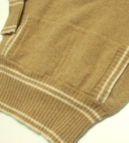 着丈65cm、身幅47cm。カラーはキャメル。70年代、スコットランド製、レディースのTWOMAXのシェットランドセーターです。これはすごい!デザインとしてはチルデンセーターのようなデザインなのですがパーカーポケットがついていてビンテージニットならではのリブ長になっていて面白く且つ可愛らしいデザインになっています。こんな可愛いセーターは滅多にお目にかかれません!
