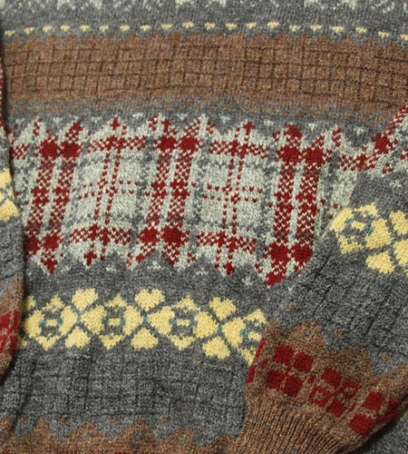 着丈65cm、身幅49cm。サイズS。カラーはブラウン×イエロー×グレー。80年代、スコットランド製、グレンカレイグのセーターです。ウール100%のセーターでノルディックとタータンチェックがミックスになった面白いパターンになります。カントリーテイストのある温かみのある一枚です。