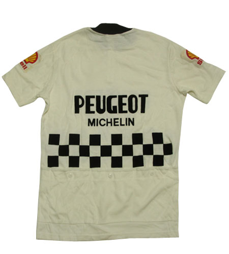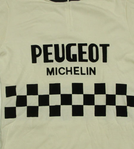 着丈74cm、身幅51cm。カラーはブラック×白。デッドストック、70年代、フランス製、プジョーのサイクリングジャージです。ニットのサイクリングジャージになります。プジョーとミシュランのフロッキープリントさらに滅多に出てこない両袖にshellのワッペンのついたタイプのジャージになります。デザインはチェッカーフラッグパターンのクラシックモデルです。