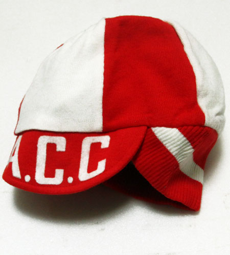 高さ19cm、フリーサイズ。カラーはレッド×白。70年代のサイクリングキャップです。大変希少な70年代当時のニットのサイクリングキャップ!色使いやデザインも70年代ならではで今見るととても新鮮ですね。ダブルウェイスのになっていて寒い時期にも対応できるようになっています。