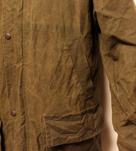 着丈85cm、身幅50cm。サイズXS。カラーはオリーブ。80年代、イングランド製のワックスジャケットです。openairというローカルブランドの物ですがイングランド製だけあってか作りと質はすごく良いですね。ウエストのハンドウォームポケット、袖の内側のニットのリブリスト、裏地のタータンチェックと言った具合でバブアに引けを取りません。特筆すべきなのは85cmというセミロング丈で身幅も細めなので、ショップコートのようなルックスでとてつもなくお洒落なんです!ワックスジャケットでこういう丈で身幅が細いのって本当にみかけないですし、オイルもまだまだ残っているので撥水性もあります。先述したように裏地もついているので風も通さないですし機能性も抜群です!バブアも良いですがこちらも相当良いですよ!