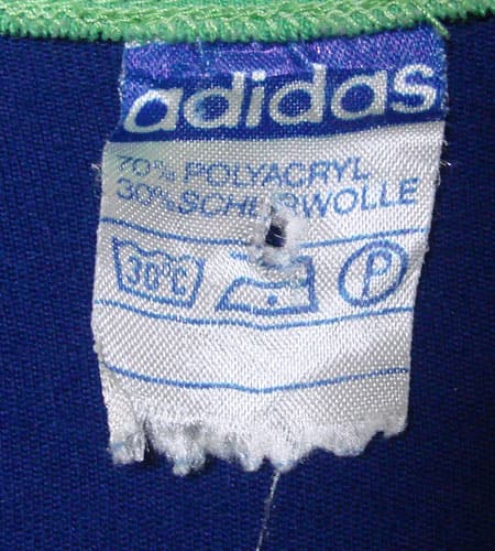 着丈64cm、身幅48cm。OPTIジップ使用。70年代、西ドイツ製、アディダスのニットジャージです。左胸の欧米から見た日本的な空手のワッペンが逆にヨーロッパっぽいですね。デザイン、配色、シルエットどれをとっても素晴らしく、リブの若草色と左裾のトレフォイルのコントラストがすごく綺麗!本当に美しいの一言につきます。