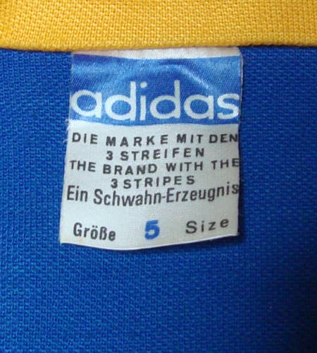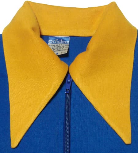 トップス:着丈62cm、身幅50cm。アンダー:ウエスト74cm、総丈103cm、股下73cm。OPTIジップを使用。70年代、西ドイツ製、セットアップのアディダスジャージです。こちらは人気のある襟付きのニットジャージで配色も希少な黄×青!さらに襟が通常このモデルはフレンチカラーなんですが、こちらはそれよりも長いロングポイントカラーになっていて右側にポケットも付いている希少なデザイン!タイトなシルエットで着た時のラインもすごく綺麗です。トレフォイルも左裾にさり気なく付いていて、そこもまた洗練されていますね。
