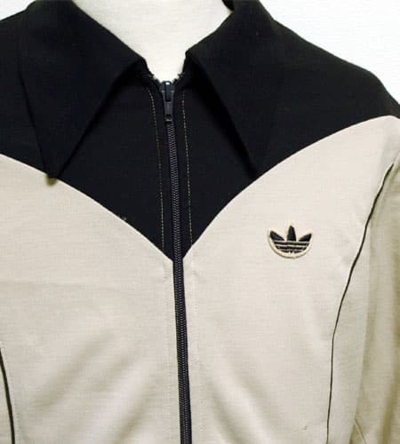 着丈65cm、身幅50cm。OPTIジップを使用。70年代、西ドイツ製、アディダスのニットジャージです。カラーは紺×ベージュになります。大きな襟が70年代独特の雰囲気を醸しだしています。シルエットが綺麗で、デザインも洗練されているので、ドレススタイルにもハマりますね。