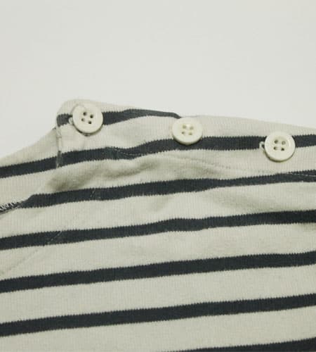 着丈67cm、身幅53cm。カラーは生成り×ネイビー。フランス製、プチバトーのマリーンボーダーカットソーです。ヨーロッパ古着定番のマリーンボーダーは何枚持っていても飽きがくることがなく着続けられるアイテムです。インナーとしても着られますし、中にサーマルやシャツ等を合わせても着られて着回しもききやすいです。流行り廃りがなくずっと着られるのも嬉しいですね。