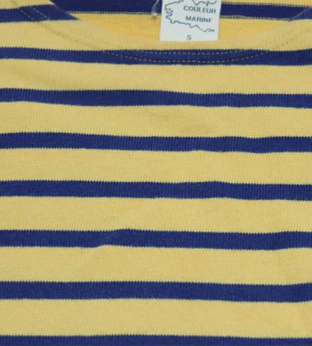 着丈63cm、身幅49cm。サイズS。カラーはイエロー×マリーンブルー。フランス製、マリーンボーダーカットソーです。ヨーロッパ古着定番のマリーンボーダーは何枚持っていても飽きがくることがなく着続けられるアイテムです。インナーとしても着られますし、中にサーマルやシャツ等を合わせても着られて着回しもききやすいです。流行り廃りがなくずっと着られるのも嬉しいですね。
