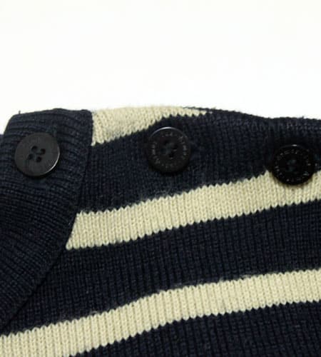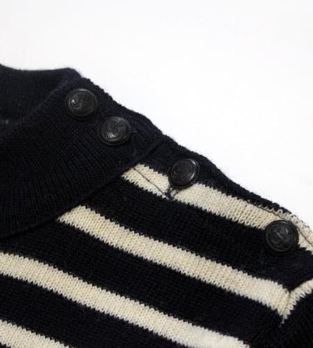着丈64cm、身幅50cm。80年代、フランス製、アルモリュクスのマリーンニットです。本場フランスのマリーンニットで今の製品とは違った趣のあるアイテムです。肩口のボタン、目の詰まった肉厚のニット、ファッション性も十分に取り入れつつなおかつ機能性に重点を置いた本物のニットです。ヨーロッパ古着では外せない一枚です。