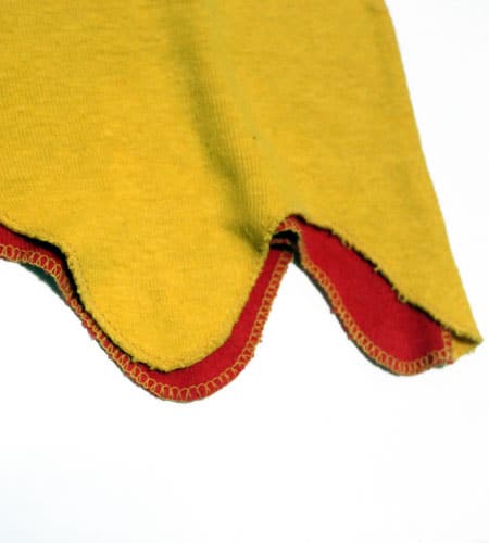 着丈63cm、身幅49cm。カラーはイエロー。70年代、西ドイツ製のユーロTシャツです。マタドールのマントのようなデザインで裾が切りっぱなしのようなステッチになっていて作りが凝っています。ユーロTシャツの特徴としては柔らかなストレッチコットンのボディーを使用しており着心地が良く着た時のシルエットが非常に綺麗になります。プリントもヨーロッパ独特で洗練されたデザインです。