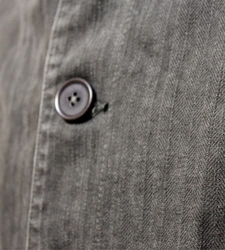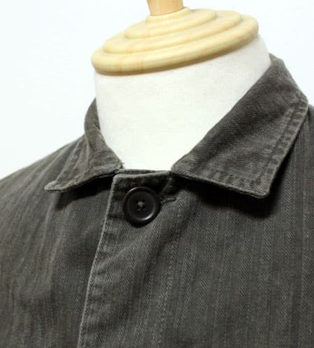 着丈89cm、身幅49cm。カラーはグレー。フランス製、ベトラのショップコートです。素材は畝のあるやや厚手のツイルコットンでブラックシャンブレーの物とは違った風合いがあります。色も良い感じで落ちていて、グランパシャツ、スモック等との相性も良くとても雰囲気のある一枚です。