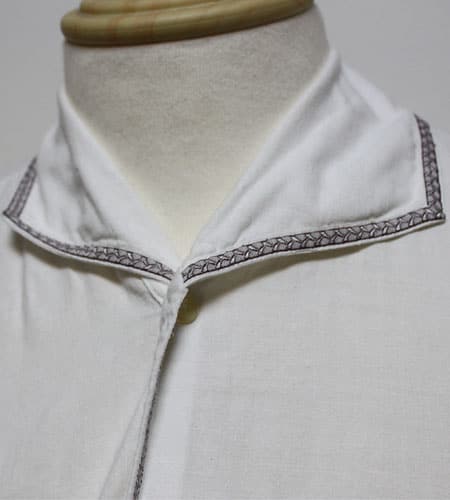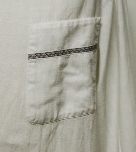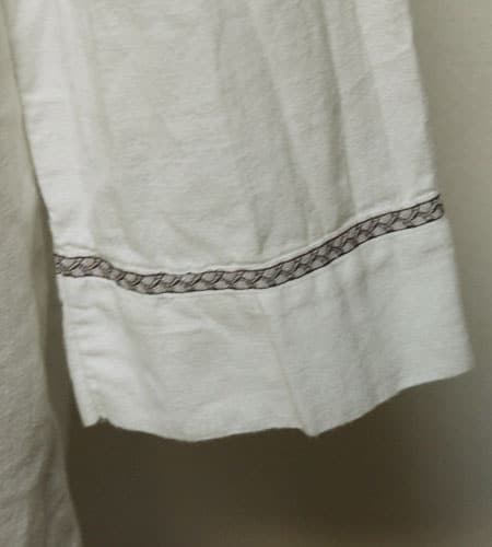 着丈108cm、身幅54cm。カラーは白。70年代、西ドイツ製のグランパシャツです。襟、フロント、袖に模様の入ったグランパシャツにしては珍しいデザインです。丈もグランパシャツの中でも長めで一枚で着てもとても雰囲気があります。
