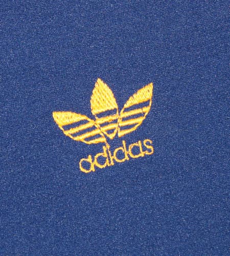 着丈61cm、身幅49cm。YKKジップを使用。70年代初期、フランス製のアディダスジャージです。ネイビー×白の三本線のアディダスではベーシックなカラーリングで、金色の刺繍のトレフォイルが映えていてとても綺麗です。