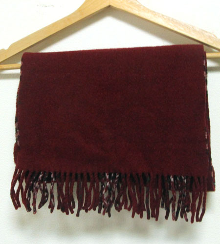 幅30cm、長さ155cm(フリンジを除く)。カラーはワインレッド。80年代、イングランド製、バーバリーのカシミアマフラーです。こちらは大変珍しいリバーシブルデザインでノバチェックとソリッドの2パターンでボリュームのあるカシミアマフラーになります。